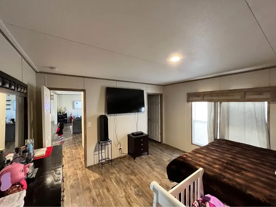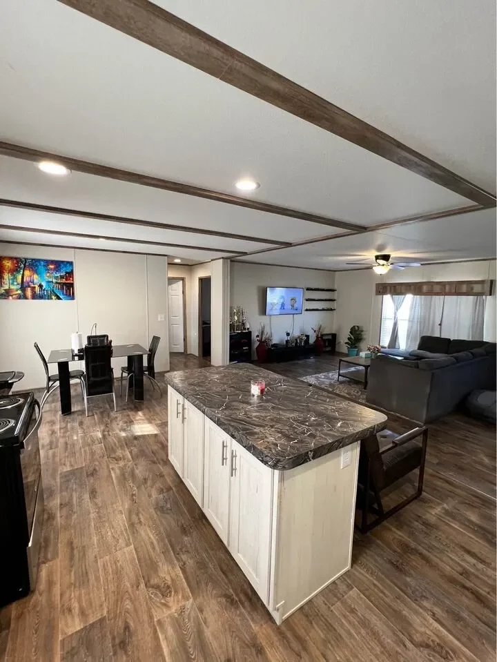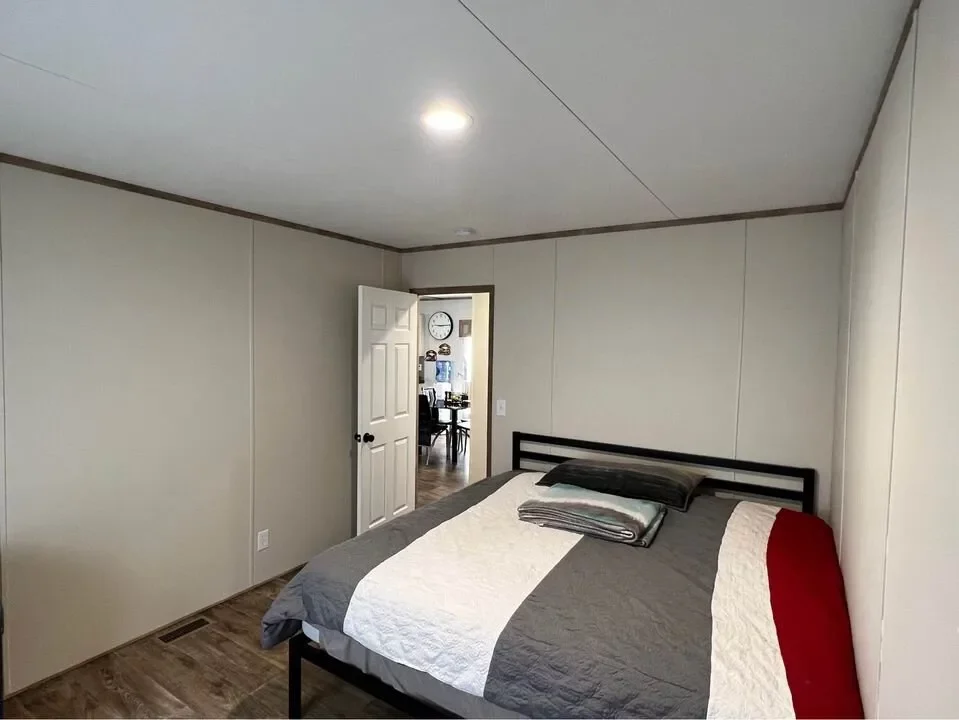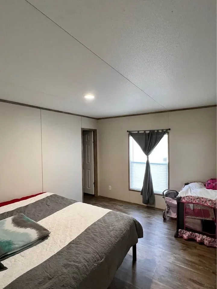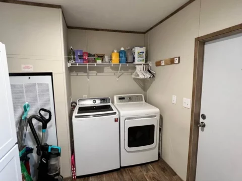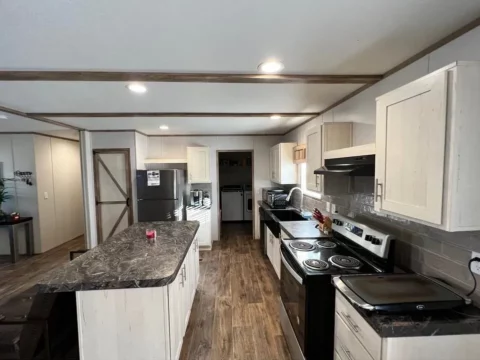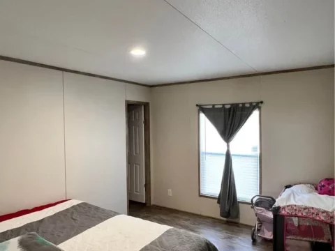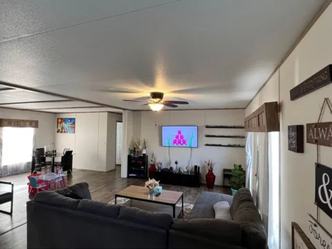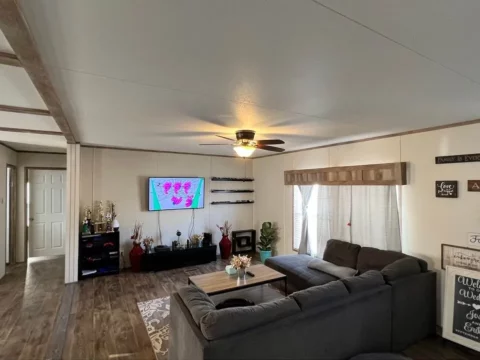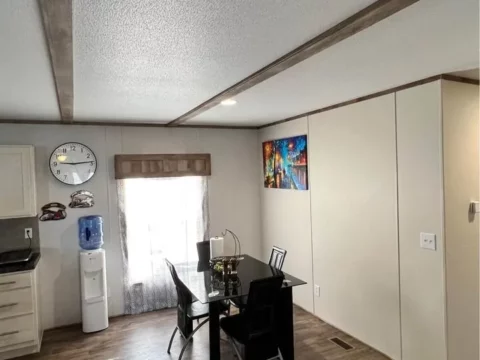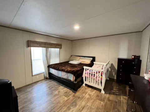 This is a 3/2, 1600 sqft built in 2022 Palm Harbor double-wide mobile home. It comes with all kitchen appliances, window coverings, double pane windows, vinyl thru-out, an 8×10 deck with a gate, and 4-car parking.