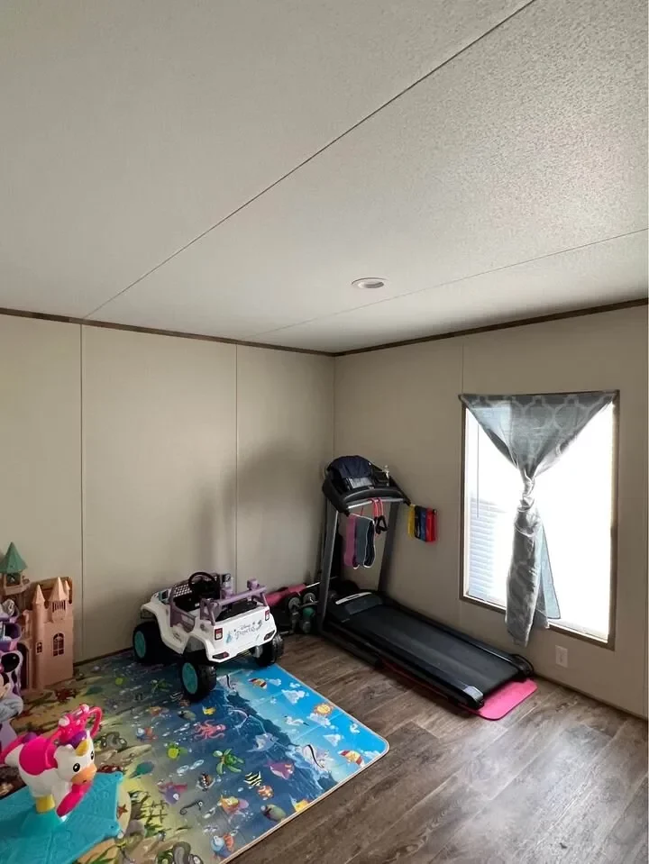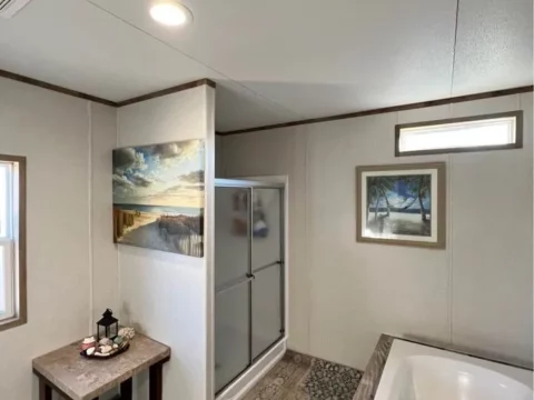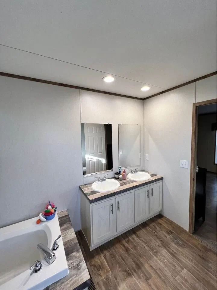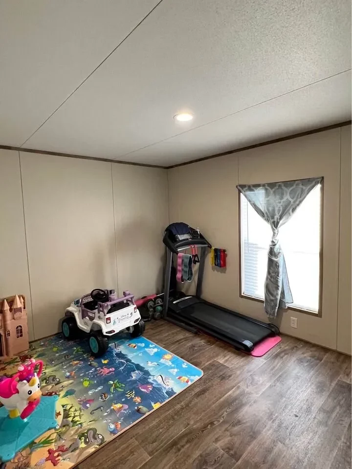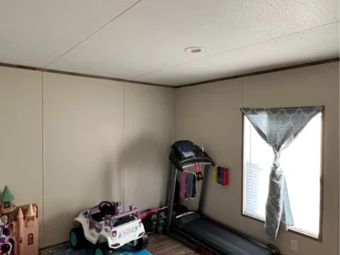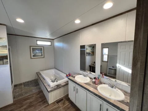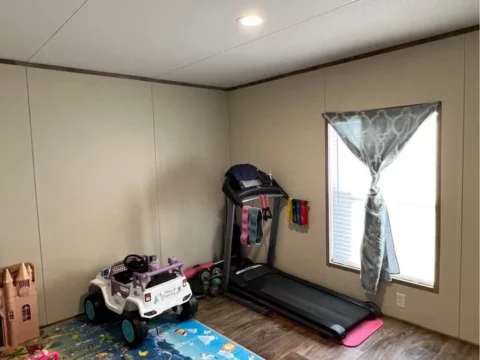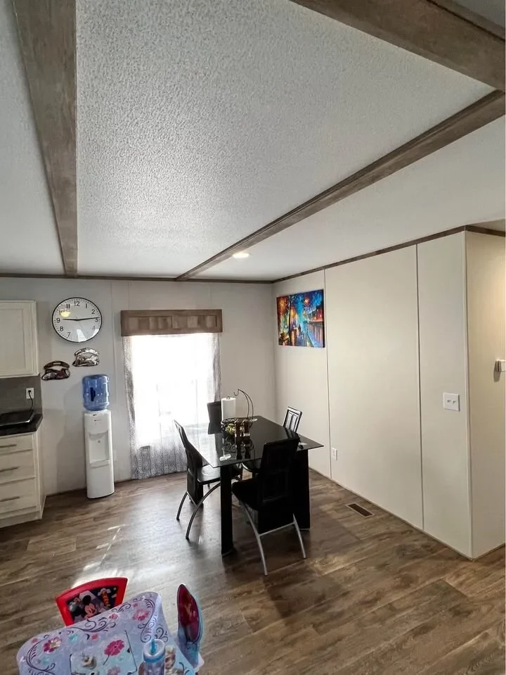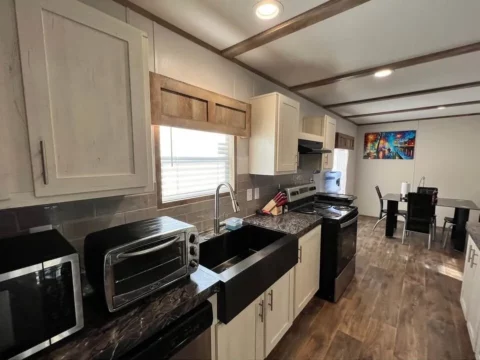 This is a 3/2, 1600 sqft built in 2022 Palm Harbor double-wide mobile home. It comes with all kitchen appliances, window coverings, double pane windows, vinyl thru-out, an 8×10 deck with a gate, and 4-car parking.