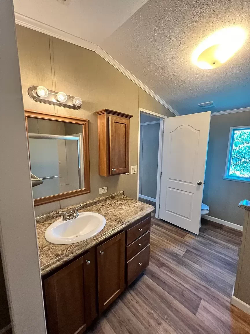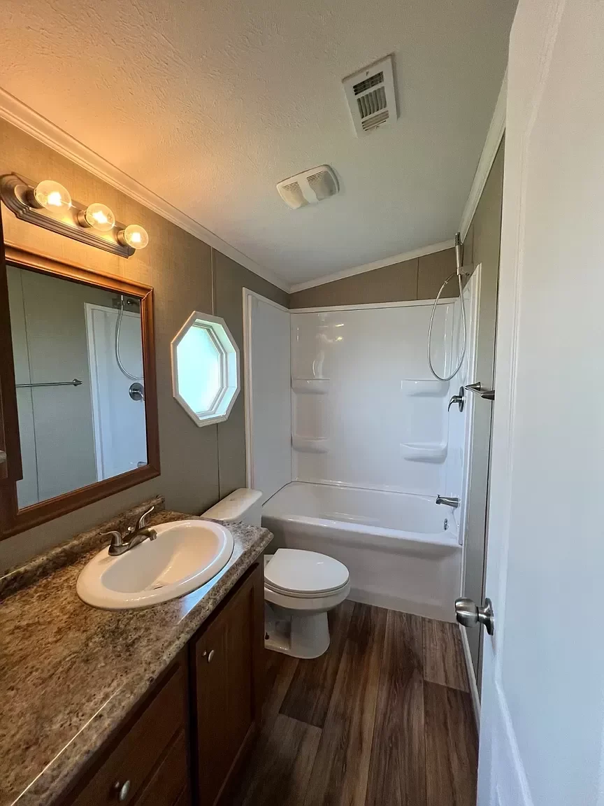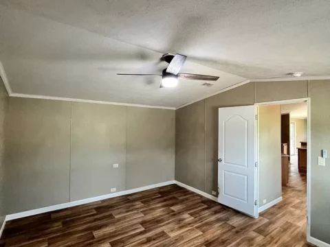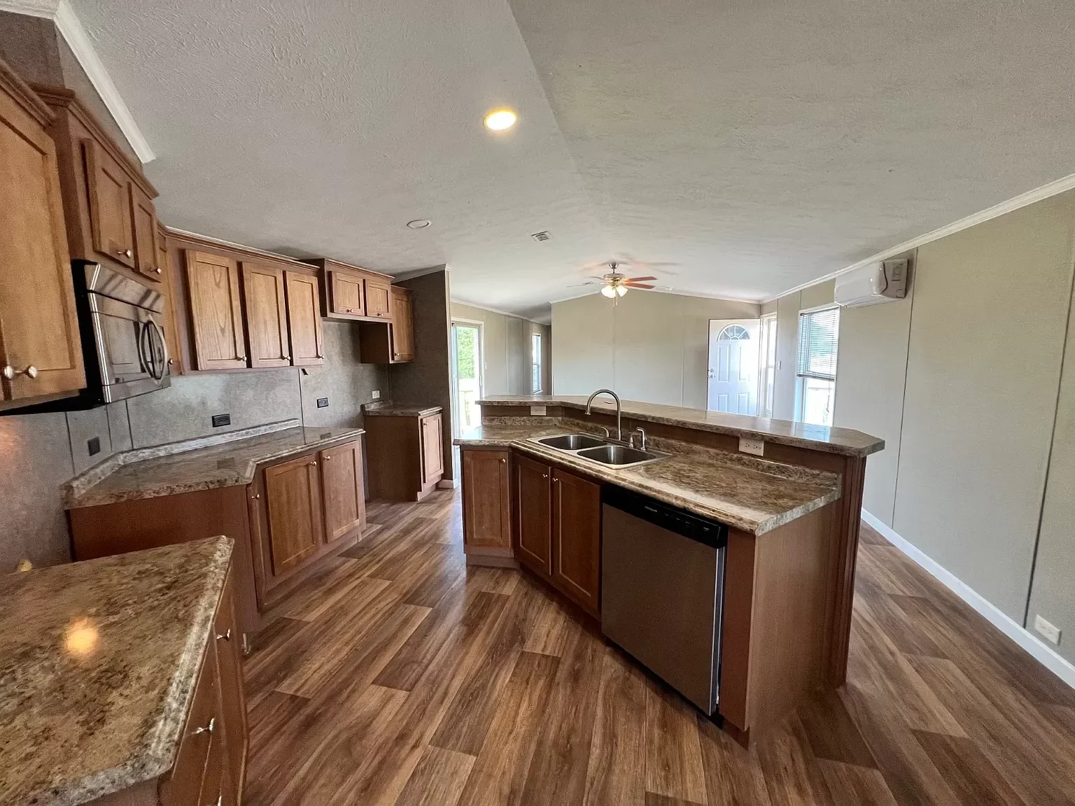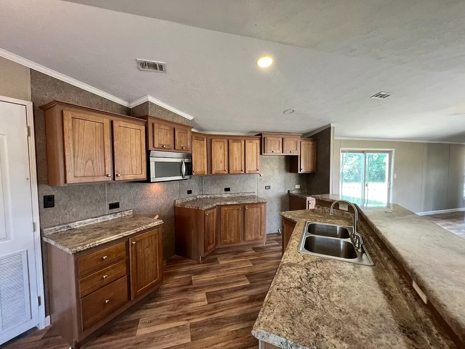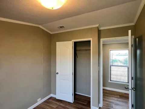 Beautifully designed 2019 single-wide 16×76, 1216 sqft home with a spacious living room, large bright kitchen with island workstation/coffee bar, king-size primary bedroom & bathroom, and 2 bedrooms up front. Located in McKinney, TX. Land not included.