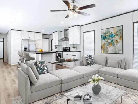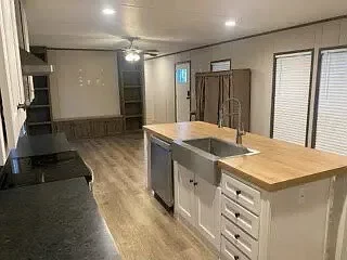 The home features an open patio, ample parking, a 12×12 shed, and quality craftsmanship throughout. Inside, you’ll find energy-efficient lighting, vinyl windows, and a stunning kitchen with a spacious island. The property is for sale by owner, with cash or chattel loan options available (estimated payments starting at $691/month, plus $805 lot lease).